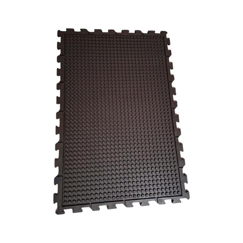 Mittelweiche 1,6 cm starke Gummimatten mit Hammerschlagoberfläche aus vulkanisiertem Neugummi. Die Umrandungen und Puzzleverbindungen in voller Materialstärke ergeben eine feste Verzahnung und verhindern gleichzeitig das Eindringen von Schmutz unter die Gummimatten. Die unterseitigen Noppen bewirken durch den geringen Bodenkontakt ein isolierendes Luftpolster.