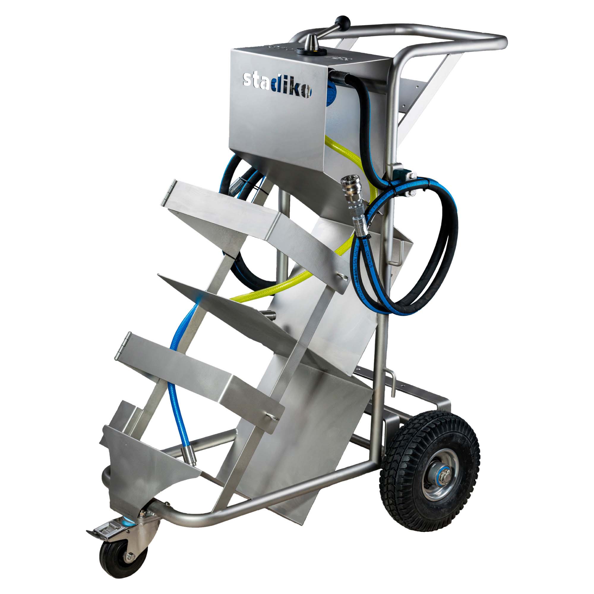 Durch seine kompakte Bauweise kann er auch in schmalen Gängen besonders komfortabel und leicht bewegt werden. Er ist mit zwei Lufträdern und einem Lenkrad für leichtes Manövrieren ausgestattet. Der Wagen bietet Platz für zwei 25 kg Kanister in Schräglage, sodass diese restlos entleert werden können.