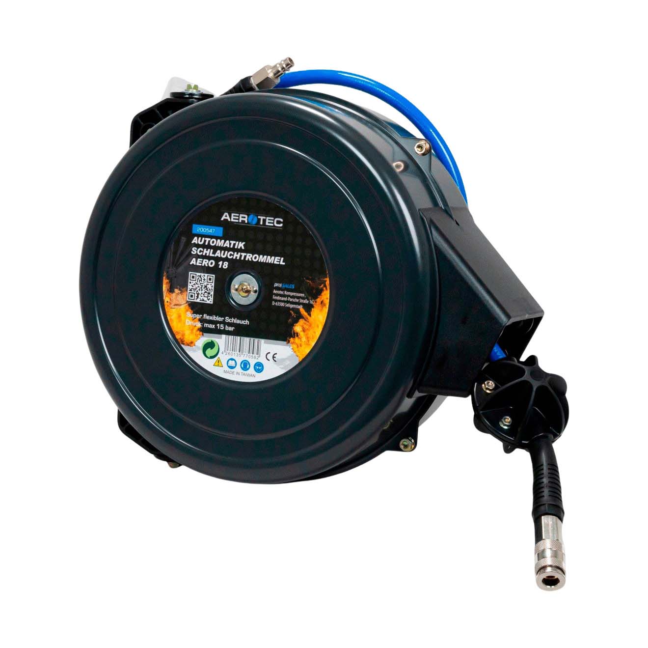 Die Trommel ist mit einem 18 m langen PU-Schlauch ausgestattet. Dieser hat einen Durchmesser von 10/15 mm und ist für einen Betriebsdruck bis 15 bar ausgelegt. Das Gehäuse ist mit einer schwenkbaren Wandhalterung versehen. Für die komfortable Benutzung ist eine Aufrollautomatik verbaut.