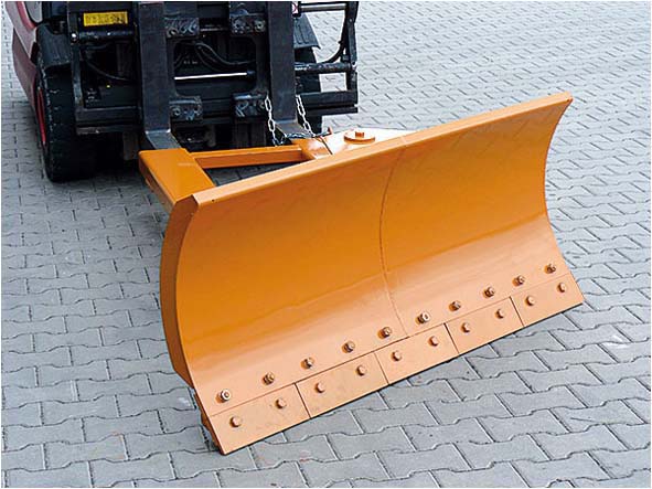 Der Schneeschieber mit Stahl-Schürfleiste dient zum Räumen schneebedeckter Flächen auf Betriebshöfen, Werksgeländen oder Parkplätzen mittels Gabelstapler. Die Aufnahme erfolgt schnell und unkompliziert durch Einfahrtaschen über die Gabelzinken, die mit einer Kette gegen Abrutschen gesichert werden.