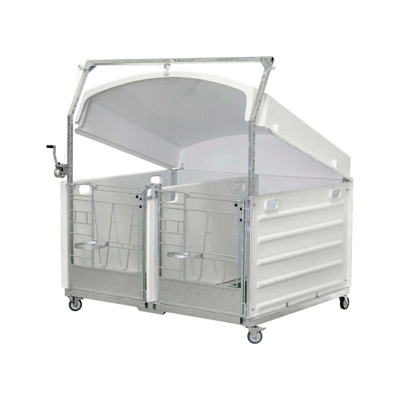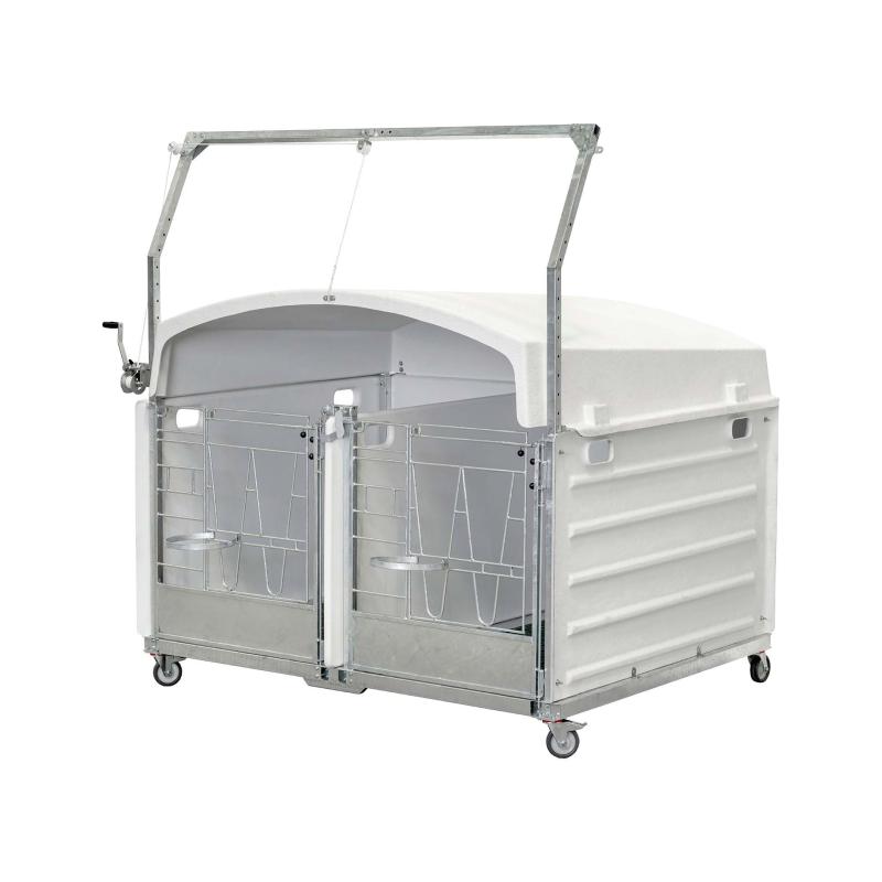 Das Open Top Duo Dachset ist für die Open Top Premium Duo Kälberhütte (Art.-Nr.: 97016-00-00) erhältlich und bietet Kälbern zusätzlichen Schutz vor Zugluft und Wind. Montage und Demontage sind einfach möglich. Das Dach ist einfach in der Höhe verstellbar. In der höchsten Position bietet das Dach ausreichend Platz, damit der Landwirt bequem stehen kann.