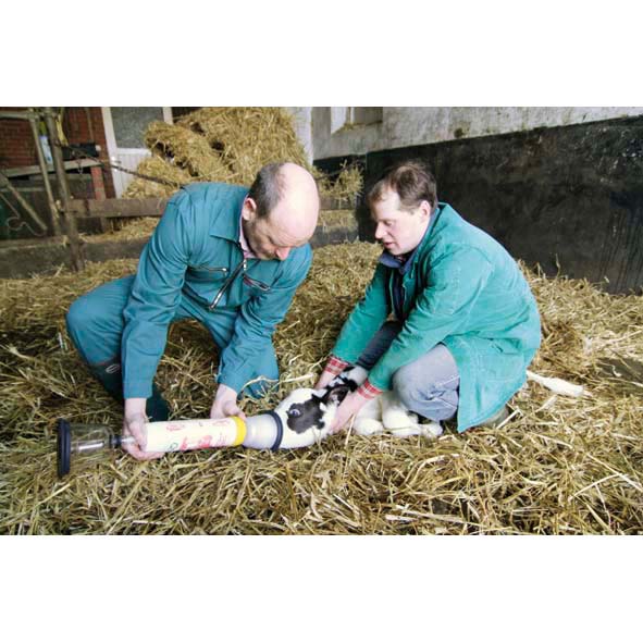 Schleimabsaugen oder Beatmen mit einem Gerät, vielfach in der Praxis und Wissenschaft erprobt. Ermöglicht jedem lebensschwachen Kalb einen guten Start.