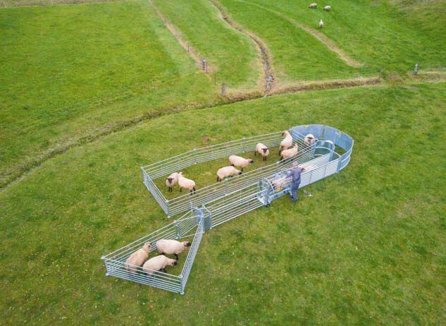 - mit dem Falltor werden die Schafe einzeln oder in Gruppen aus dem Sammeltrichter in den Laufgang eingelassen und / oder aus dem Laufgang entlassen